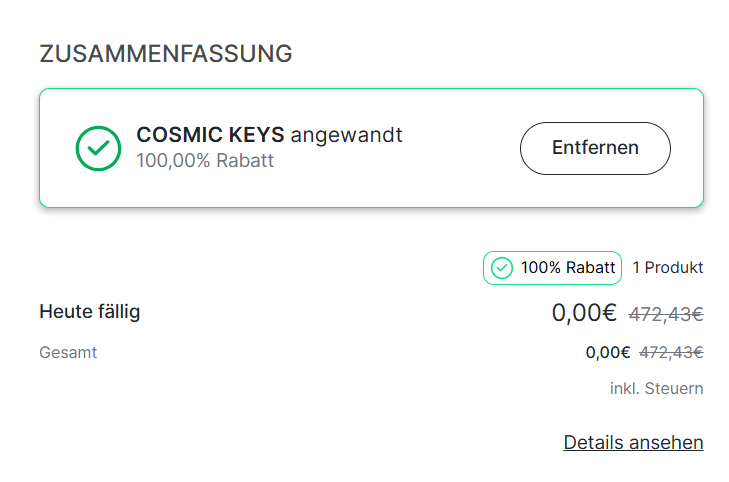 Gib im Gutscheinfeld den Code COSMIC KEYS ein - so wird der Preis für den Minikurs um 100% reduziert und du kannst sofort loslegen! |