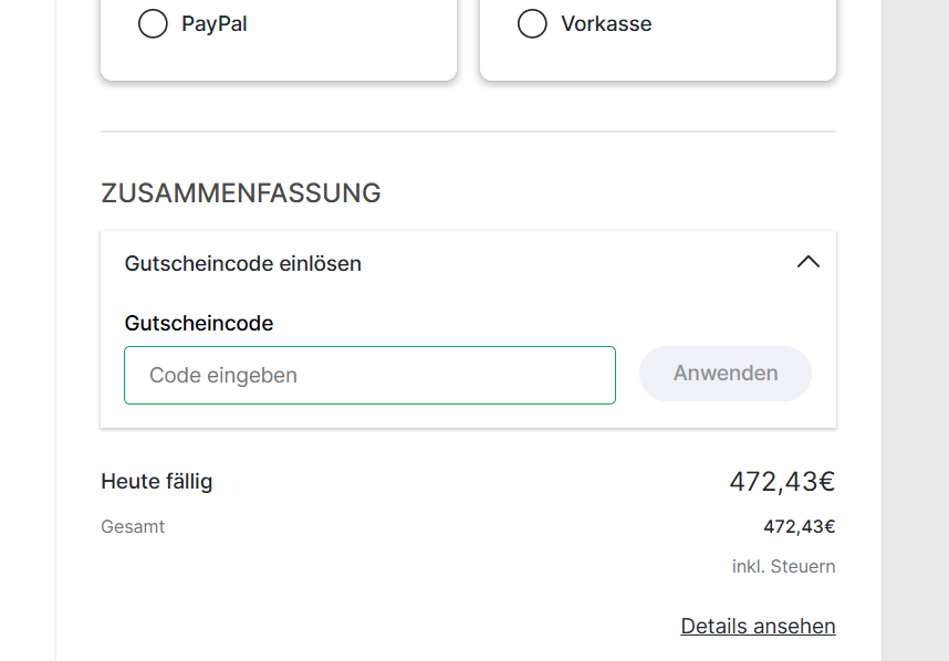 Dort scrollst du runter bis zu den Zahlungsinformationen zum Feld "Zusammenfassung - Gutscheincode einlösen" - gib auch die angeforderten Rechnungsdaten mit ein |